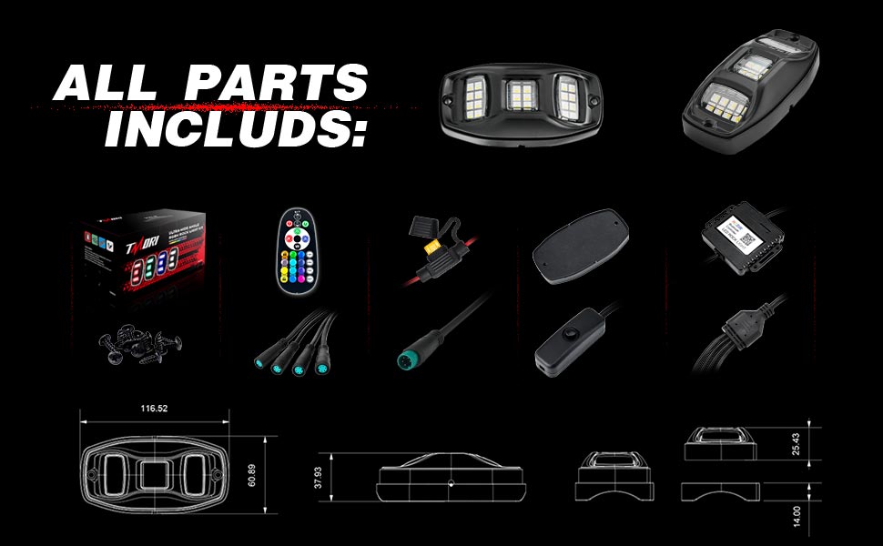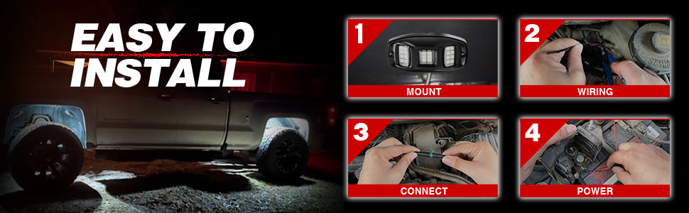 ➤【SWITCH WIRE WITH POWER BOTTON INCLUDED. INSTALL EASILY】 We provide switch wire with power potton(help to turn on/off the lights with the power button), screws tools, bluetooth control box, remote control, the length of each rock lights wire is 11.4Ft. You can also add more extension wires as you like. Easily connect each rock lights and easily drilled onto your truck fender board.