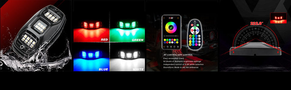 ➤【TRIPLE LUMINOUS ZONE WIDE ANGLE RGBW ROCK LIGHTS. COMPATIBLE WITH ALL TRUCKS/SEDANS/ATV/UTV/BOATS】9V-32V wide range working voltage. Add separate led for pure true white color, NOT the same with others' RGB model mixed white color. Working perfectly on sedans, trucks, suv, utv, atv, boats, motorcycles. Come with 11.5 feet of wire per light, you can add more extension wires as you like.