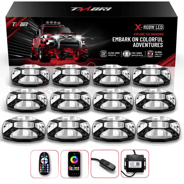 TMORI X-Series RGBW Rock Lights for Trucks & UTV - 12 Pods, App Controlled Flashing Music Mode